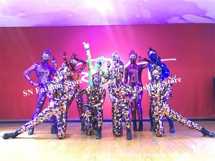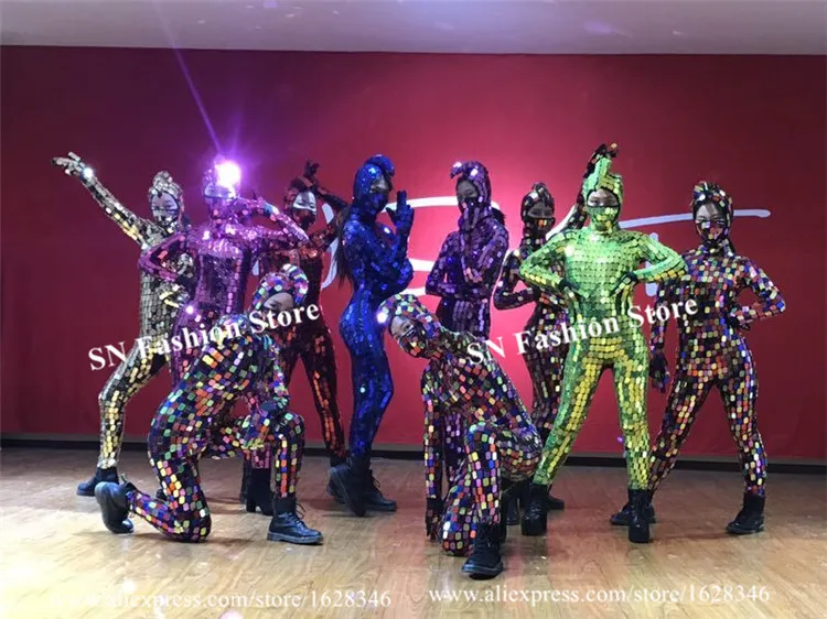 Super Sale M54 Ballroom dance colorful mirror costumes stage bodysuit silver mirror outfits dj mask performanc
